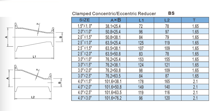 Eccentric Reducer – one side is flat, preventing liquid pooling.